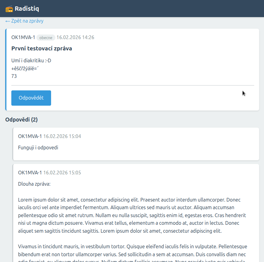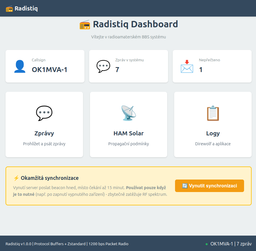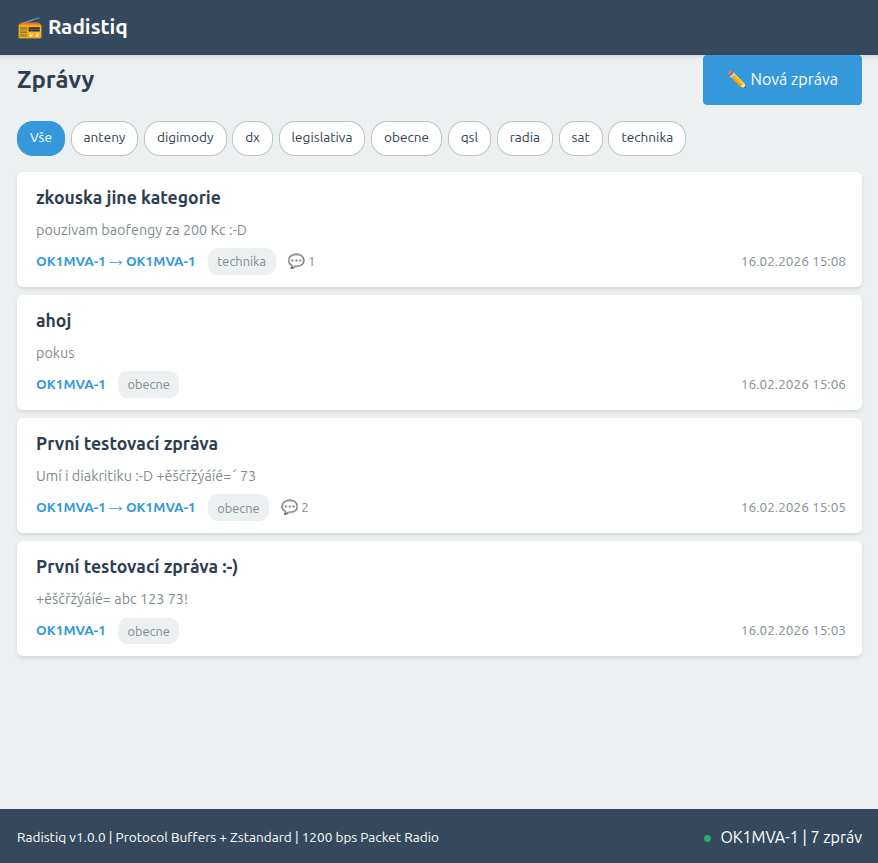 Radistiq je modernĂ BBS (Bulletin Board System) pro packet radio. Funguje jako WhatsApp skupina pĆes rĂĄdio - server pravidelnÄ vysĂlĂĄ beacon se seznamem zprĂĄv, klienti si porovnajĂ svou lokĂĄlnĂ databĂĄzi a pokud zjistĂ, ĆŸe jim nÄco chybĂ, poĆŸĂĄdajĂ server o novĂ© zprĂĄvy. Ty se pĆenesou rĂĄdiem a uloĆŸĂ se vĆĄem klientĆŻm, kteĆĂ jsou na pĆĂjmu. NemusĂĆĄ bĂœt neustĂĄle pĆipojenĂœ - zapneĆĄ klienta, ten se automaticky dosynchronizuje a ty si v klidu pĆeÄteĆĄ, co je novĂ©ho, pĆes webovĂ© rozhranĂ v prohlĂĆŸeÄi.